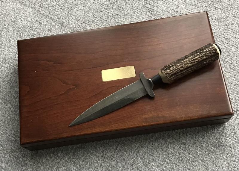 Supplied in a superb rosewood presentation box, this knife from the eighties is in 'as new' condition and comes with the original Kershaw paperwork, consisting of a guarantee card and a certificate from the renowned Solingen Sword Smith Manfred Sachse, confirming that he was the maker of the beautifully Damascus blade. This blade has been set into a stag grip and now rests within a compartment in the case. Black leather scabbard has both a grip strap and crossguard strap, is in mint condition and is stamped 'made in Germany' to the reverse.Mint.