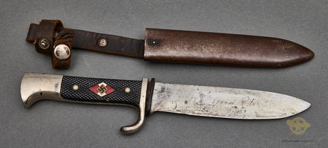 German WWII HJ Knife w/Motto by C. LĂŒtters & Co-This is a good starter knife for a new collector. This is an early HJ knife with a motto by an early maker, a maker we don't see very often. This Hitler Youth knife retains 90% of its nickel silver finish on the pommel and hilt. The buffer is in place under the crossguard, but it is loose. The checkered grip plates are very good, but please look at the photos as there is a spot of paint on the reverse. The HJ enameled diamond is sound condition, though it does have a scuff on its face on the lower red enamel. Please see photos. The scabbard has lost almost all of its original black paint. The remaining steel has become a brown color that almost looks like it has anodized. It is a very interesting look. There is some black finish remaining on the reverse of the scabbard. The blade is in sound condition. It shows the motto, and it is a good etch that is readable. However someone has beat the heck out of this blade, it does show where it may have been nicked and sharpened. This is what happens when you give a 14 year old a knife, I guess. The C. LĂŒtters & Co lion logo can be seen on the reverse. Again, a scarcer maker that we do not see very often. This has a leather retaining strap that works as it should. An interesting knife, and a good affordable way for a collector to get a HJ knife with a motto. A good placeholder.History: The Hitler Youth Knife (Hitlerjugend Fahrtenmesser) was introduced in the summer of 1933, shortly after the Nazi seizure of power in Germany. It was produced by a multitude of manufacturers and could be purchased from authorized shops for a price of 4 Reichsmarks. It was used not only as a dress sidearm, but as a functional camping tool, and these were commonly sharpened by their original owners. The earliest examples bore the motto of the Hitler Youth, 'Blut und Ehre!' (Blood and Honor), etched on the blade. The blades on these early knives were marked with commercial manufacturer logos. They had nickel silver handles, and anodized metal scabbards. The use of the etched motto was discontinued in August 1938. Later HJ knives had nickel plated steel handles, painted scabbards, and the maker logos were replaced with an RZM code along with the year of manufacture. There are also transitional types that still have the etched motto but have dates on the blade ricasso. Manufacture of these knives is believed to have ceased around 1942. All HJ knives have the diamond emblem of the Hitler Youth on the handle.Online checkout is not supported for edged weapons. Please note that some items are listed as 'SOLD OUT' for this reason. All edged weapons listed on the website are available for purchase. Please contact us for any questions, or to purchase thanks!