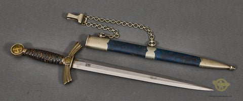 German WWII 1stModel Luftwaffe Dagger by Helbig-The blue Moroccan leather handle and scabbard are in sound condition. There is scuffing to the handle. There are two significant holes in the leather on the reverse side of the scabbard. The wire twisted wire grip wrap is in place and nicely toned to a gold color that matches the toning of the sunwheel inlay at the top. This is an early example with solid nickel fittings throughout including the chain hanger. The pommel cap and hilt retain 90% of their finish, and the brass swastikas have a nice finish and details. The nickel silver fittings on the scabbard are also in good condition with the fitting near the tip of the scabbard showing some finish loss. The blade on this example is in strong very good condition with the Helbig logo just under the crossguard. The solid nickel chain is also in great shape. You will not be disappointed in this dagger at this price point!Online checkout is not supported for edged weapons. Please note that some items are listed as 'SOLD OUT' for this reason. All edged weapons listed on the website are available for purchase. Please contact us for any questions, or to purchase thanks!