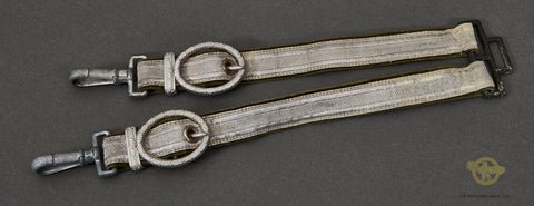 German WWII Army Hangers-This is a set of near excellent hangers. This has a plain top clip that has lost all of its original silver finish. But this is not a distraction. The straps are a mix of silver flat wire and green. They are backed in a green velvet that is excellent. The buckles are ornate and decorated with a leaf pattern. They retain nearly all of the original silver finish, they have a beautiful, frosted look. The snap clips retain almost all of their original silver finish and are nicely pebbled. They work as intended These are in very good condition overall.