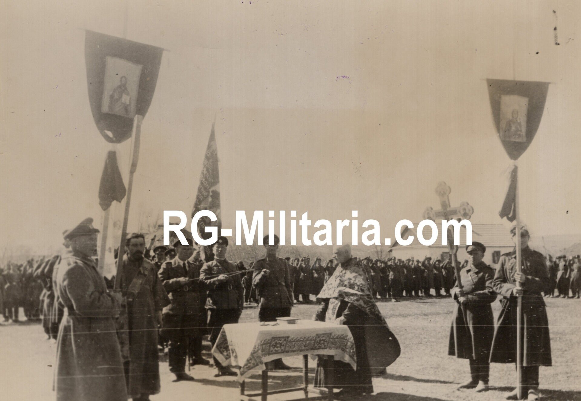 Original WW2 German Waffen SS Press Photo - OstlegionenEastern European SS Cavalry Kosaken Corps take the oath for Hitler (1943)Approximately 18 x 13 cmBy Kriegsberichter CasperWith a regimental flag of the Kosaken.Interesting picture of the SS Cossack Cavalry Corps. These units were composed of volunteers or prisoners from Eastern Europe or West Asia. The soldiers wore Wehrmacht uniforms with their own tabs and shoulder boards. Led by the Waffen SS under Helmuth von Pannwitz.Originele Wo2 Duitse Persfoto - Ostlegioen Oost Europeaanse Waffen SSKozakken Cavaleriekorps zweren de eed op Hitler (1943)Ongeveer 18 x 13 cmDoor Kriegsberichter CasperMet een regimentsvlag.Interessante foto van het SS Kozakken Cavaleriekorps. Deze eenheden bestonden uit vrijwilligers of gevangenen uit Oost-Europa of West-Azië. De militairen droegen Wehrmacht-uniformen met hun eigen emblemen. Ze werden geleid door de Waffen-SS onder leiding van Helmuth von Pannwitz.