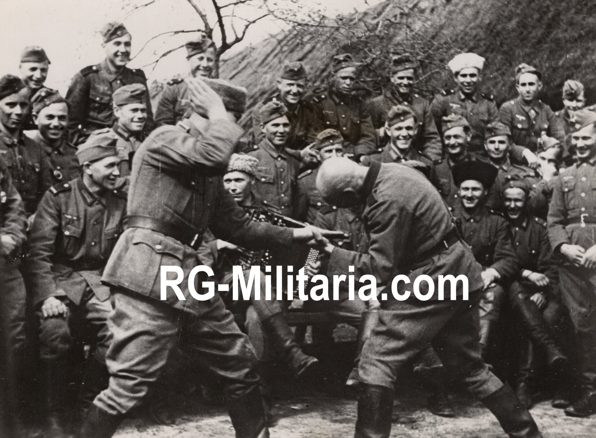 Original WW2 German Waffen SS Press Photo - OstlegionenEastern European SS Cavalry Kosaken Corps dancing (1944)Approximately 18 x 13 cmBy Kriegsberichter EtzoldInteresting picture of the SS Cossack Cavalry Corps. These units were composed of volunteers or prisoners from Eastern Europe or West Asia. The soldiers wore Wehrmacht uniforms with their own tabs and shoulder boards. Led by the Waffen SS under Helmuth von Pannwitz.Originele Wo2 Duitse Persfoto - Ostlegioen Oost Europeaanse Waffen SSKozakken Cavaleriekorps dansen (1944)Ongeveer 18 x 13 cmDoor Kriegsberichter EtzoldInteressante foto van het SS Kozakken Cavaleriekorps. Deze eenheden bestonden uit vrijwilligers of gevangenen uit Oost-Europa of West-Azië. De militairen droegen Wehrmacht-uniformen met hun eigen emblemen. Ze werden geleid door de Waffen-SS onder leiding van Helmuth von Pannwitz.