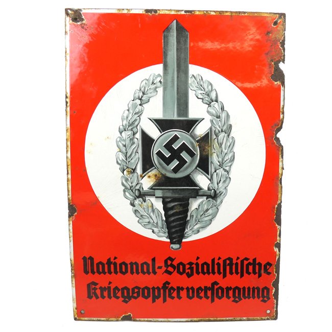 NSKOV (Nationalsozialistische Kriegsopferversorgung) Enamel Sign. The 'Nationalsozialistische Kriegsopferversorgung' was established in 1930 and was a social welfare organization for seriously wounded veterans as well as frontline fighters of World War I. The sign measures approximately 65 x 48 cms and is maker marked by the company of 'C. Robert Dold' from Offenburg. It is showing some damages and rust but is in overall good condition, see photos. Decorative original sign!