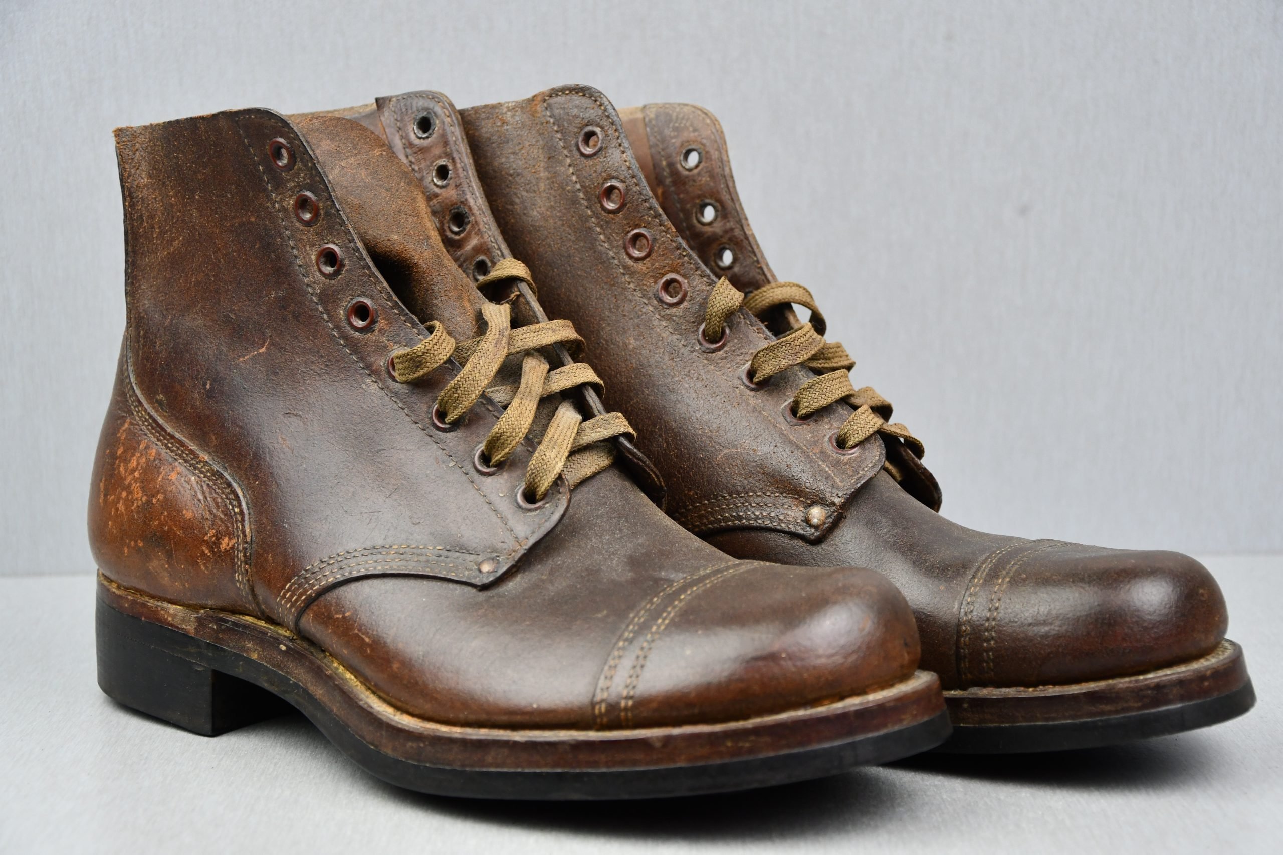 US WW2 Rough Out Service ShoesOfficially known as 'Shoes, Service, Combat, Reversed Upper, Type III' in the WW2 US Army Quartermaster Historical Studies these were constructed with flesh out leather, a full length composition sole and toe cap;They retain the four rivets typical of early production rough-outs and have been greased/polished which gives them a slight sheen.Shoes are size 8 1/2C, the maker markings inside the shoe are illisible. Boots remain unworn and could be rated as MINT.This type of shoes is typical footwear of the GI during the Normandy landings and subsequent fighting in France and the liberation of Europe.