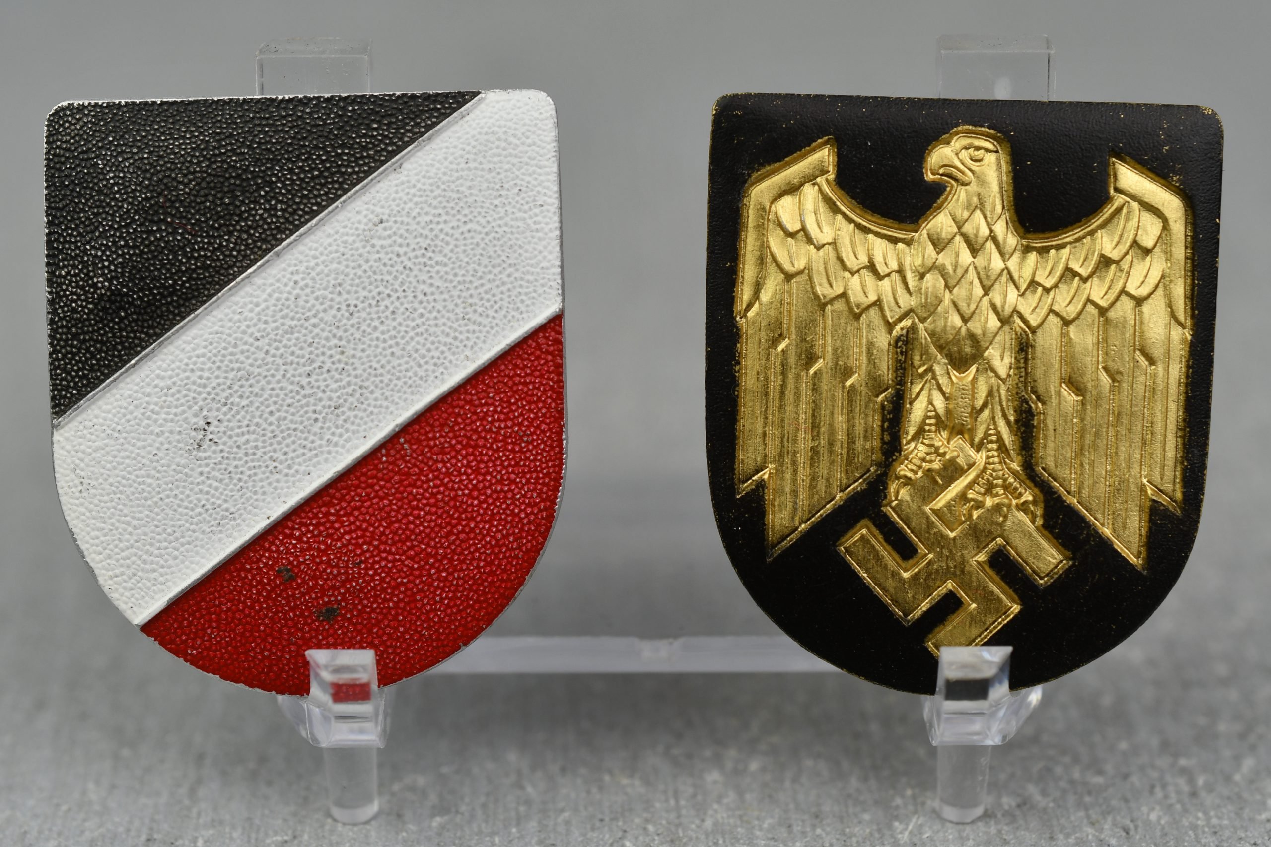 Excellent set of pith helmet decal shields. Gold navy eagle and matching tricolor, would go on each sides of the Kriegsmarine tropical 'Afrikakorps' pith helmet. Executed in aluminum, complete with all prongs intact. Maker marked eagle shield G.B. 41.
