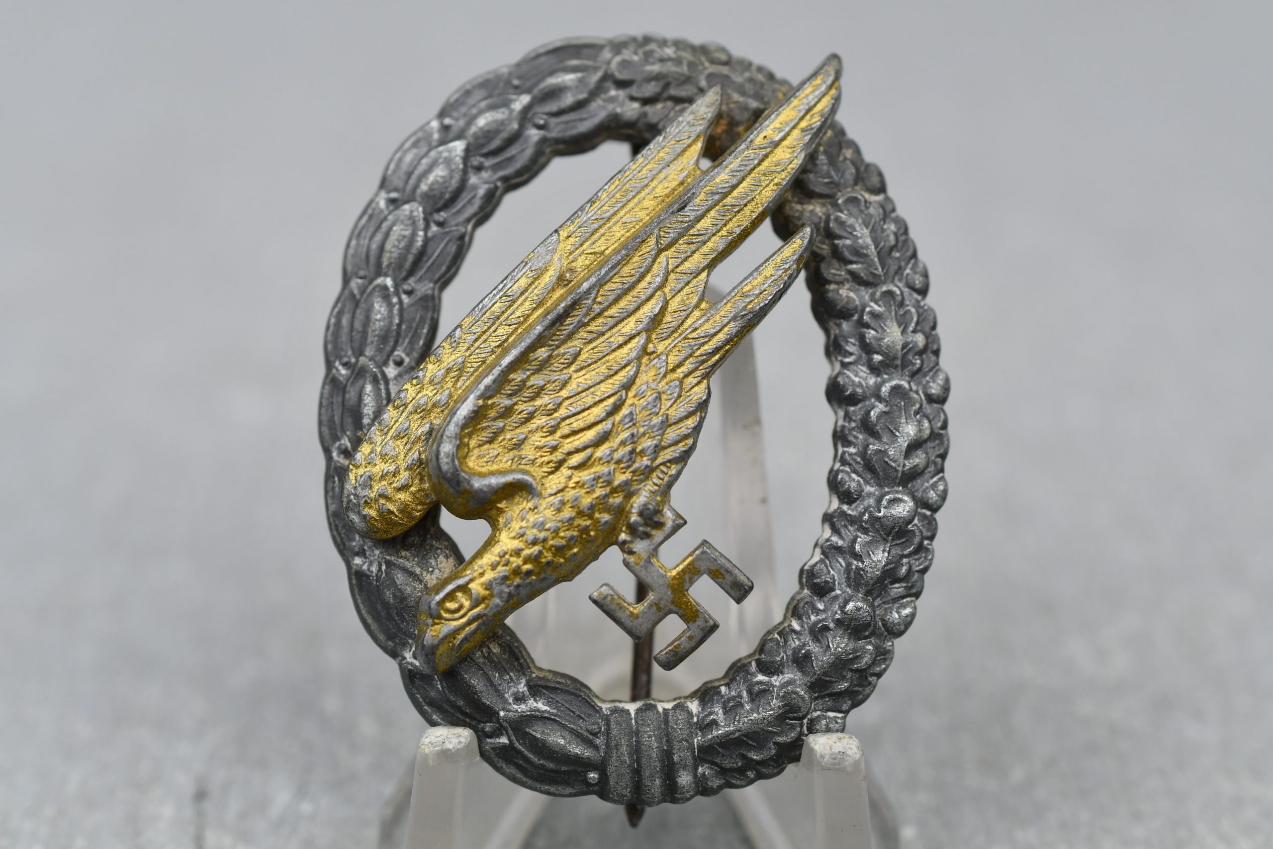 Original light worn paratrooper badge. A truely combat worn piece still retaining lots of golden gilt on the eagle! Unmarked example, made by the firm of Friedrich Linden, Lüdenscheid (F.L.L.). Late war zinc constructed para badge with setup on the wreath and riveted gilded eagle. The wreath shows a faded finish giving it a dark grey appearance with the eagle having nearly full gliding remaining.