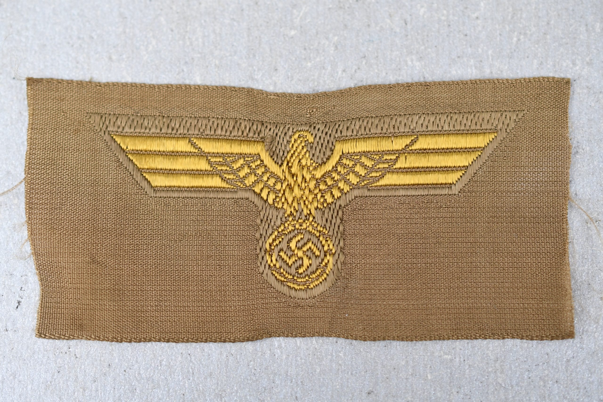 Standard Kriegsmarine tropical 'Afrikakorps' cap eagle. Gold flat woven 'BeVo-weave' example on tan colored backing.