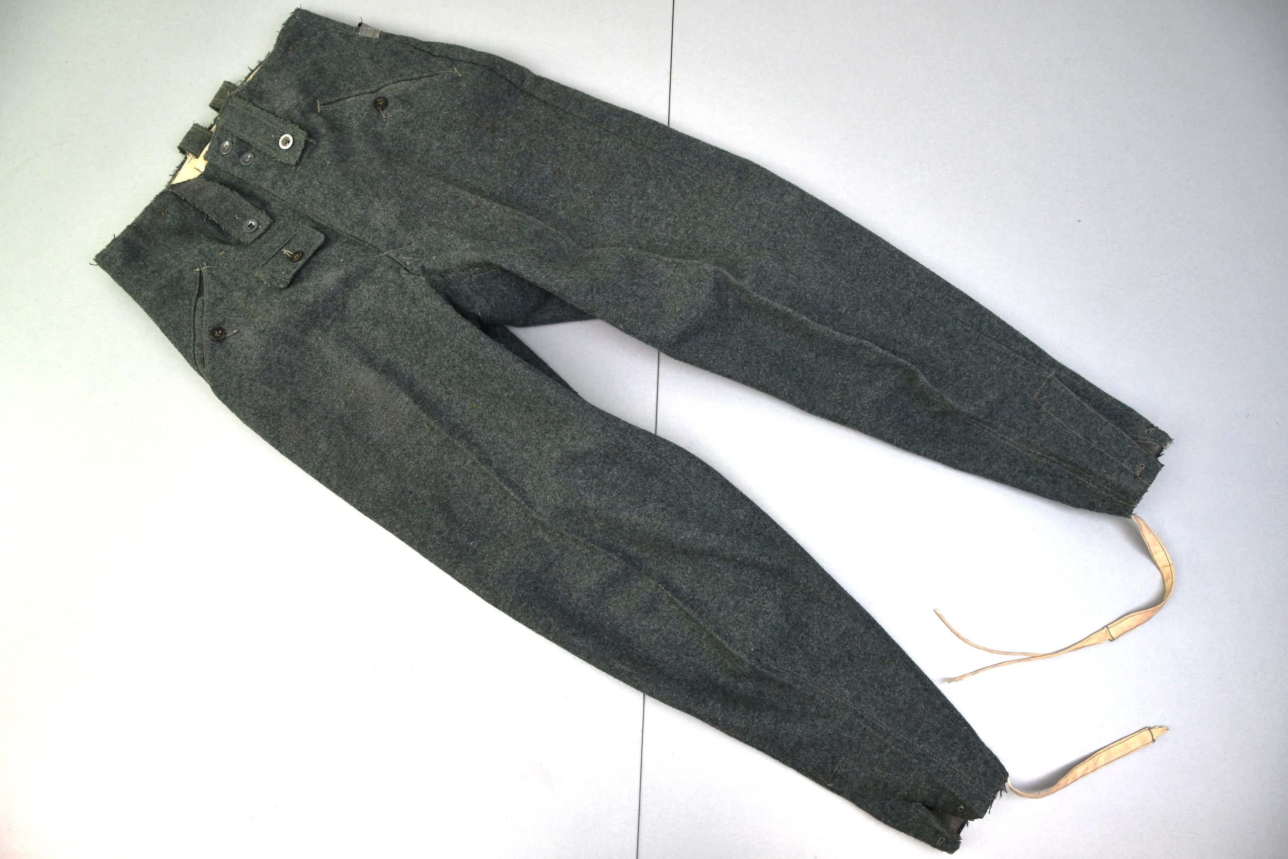 Late war pair of M43 pattern army (Heer) and/or Waffen-SS trousers. These are executed in field green 'itchy' wool and therefor could be seen as rare! Ankle ties are partially present and show wear. The trousers are light worn and have a few professional repaired damages (see picture inside). Liner is made out white cotton. Shows size markings and a RBNr. manufacturer code. Construction ca.1944. A honest pair of M43 field trousers.