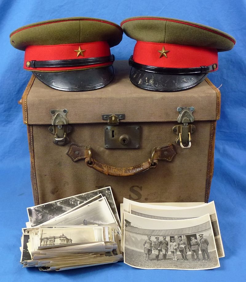 From 1924 to 1927 Yoshio Shinozuka served as the Military AttachΓ© to Austria & Hungary and thereafter rose through Imperial Army positions to include assignment to the 3rd Imperial Guards Regiment; Commanding Officer 1st Infantry Regiment; Instructor at the Army Infantry School; Commanding Officer 1st Imperial Guards Brigade; General Officer Commanding 10th Division; General Officer Commanding 1st Army [China]; Commandant of the Military Academy; and, from 1941 to 1942, as a Member of the Supreme War Council. He retired in 1942 and he committed suicide in September of 1945. The group is comprised of two of General Shinozuka's visor caps in their carrying case, together with a group of approximately 155 photographs of varying sizes which depict both civilian and military scenes. Many of the photographs bear handwritten notations in kanji. The two visor caps are both constructed of a fine olive green ribbed wool, with red wool cap band and piping. One cap show significant age damage to the surface of the visor and wear to the interior lining. Both caps have the owner's name embroidered on the lining. While both caps exhibit use and age, both caps have a fine shape and make a very good appearance. The caps are contained within their hard, cloth covered, carrying case which bears the initials of 'Y.S.'.