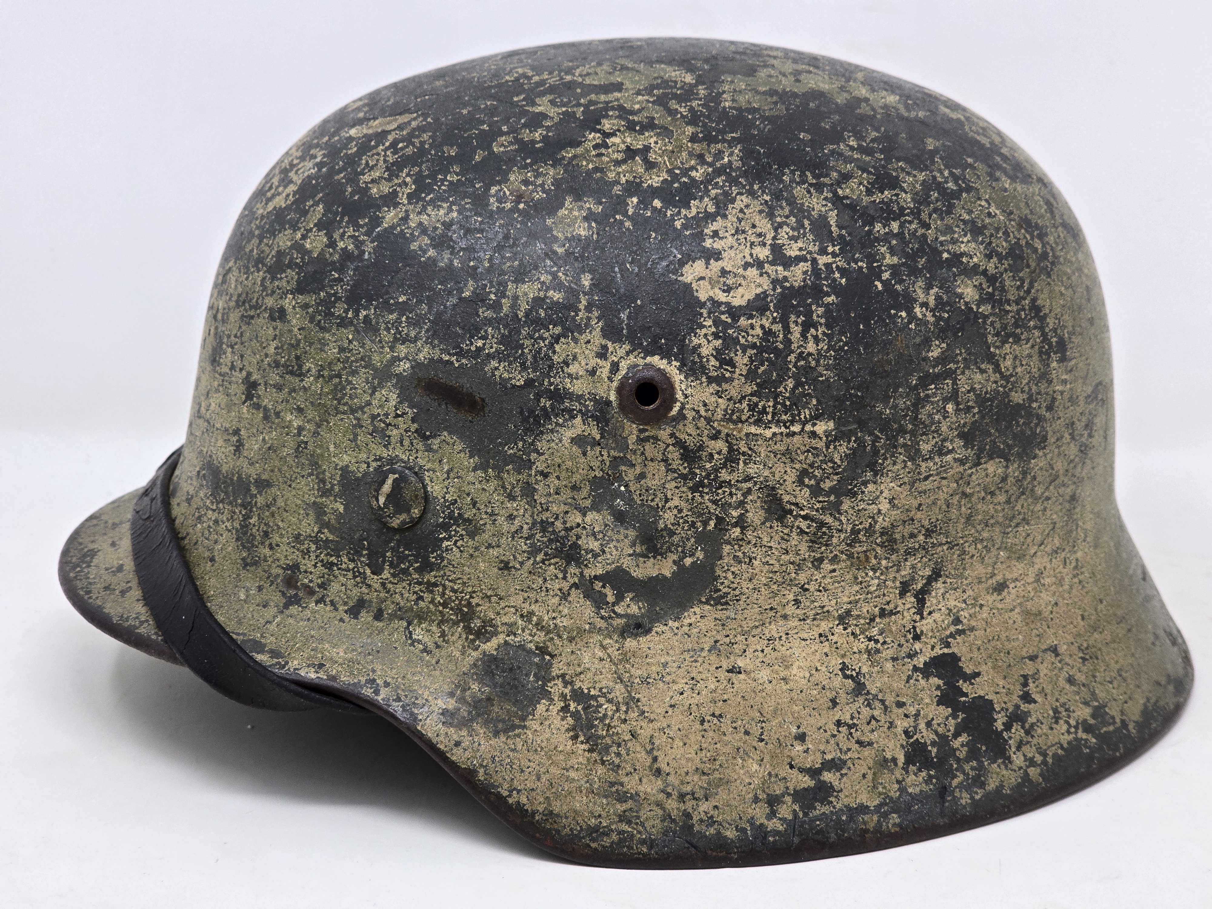 This is a salty, heavily service used tan and light green camo M35, NS66, (#appears to be 6172). The finish is a heavily worn base tan with spritz of light green in a few areas. This is on top of a reissue finish, which is still very intact. A single Heer shield is partially intact under the tan paint. The liner and chinstrap are in good but heavily worn condition; not rotten or compromised. The interior overall shows a lot of patina, and there is a slightly legible name in the rear skirt. Overall a great combat example, COA accompanies.