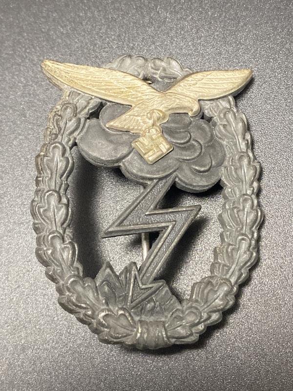 Original unmarked zinc Luftwaffe Ground Assault Badge produced by JE Hammer & Sohn. Two price construction with river fitted eagle. Typical factory assembled hardware on the reverse. Hard to upgrade.