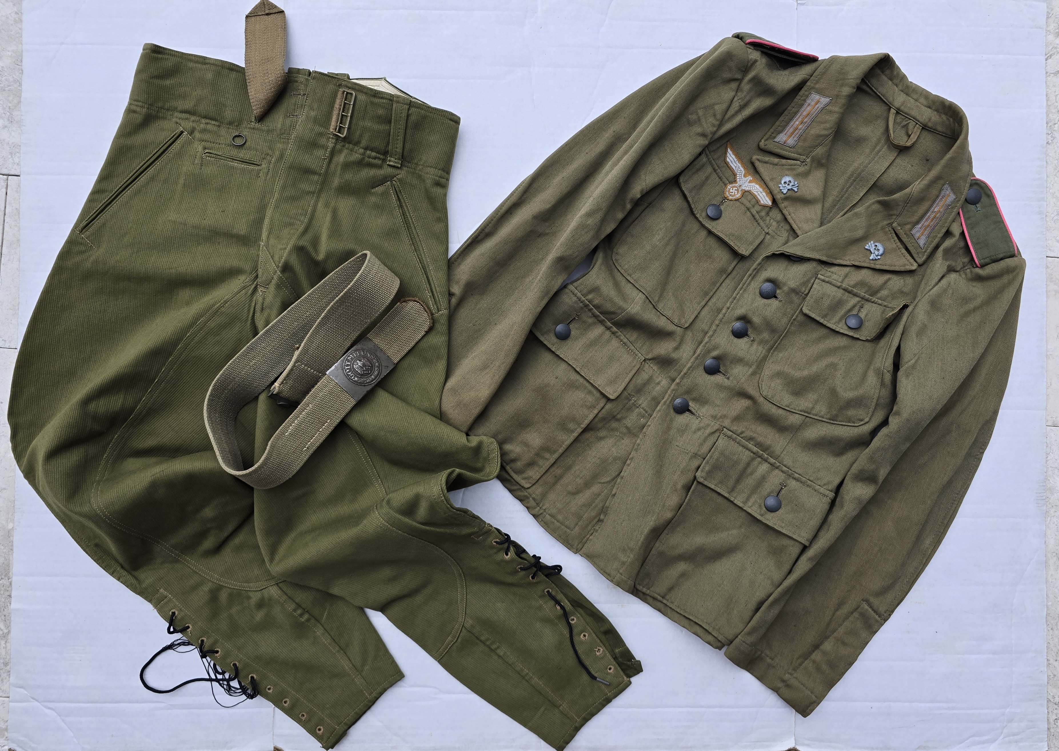 This set, from a recent collection buy, consists of a tropical M43 Heer jacket, badged for panzer (skulls are real, not sure when attached; boards are collector added), along with ribbed cotton tropical trousers and a tropical canvas belt with 1940 dated feldgrau painted buckle. The pictures show all features and markings well. Basically a ready made uniform display for tropical Heer pz. COA with appropriate caveats accompanies. Sold as a Set.