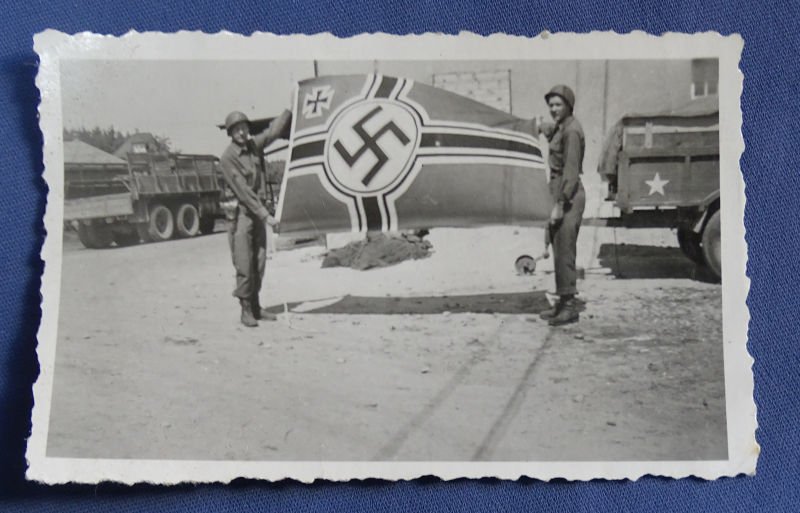 WWII Photo Two GIs with German Battle Flag 3-1/4 x 2″