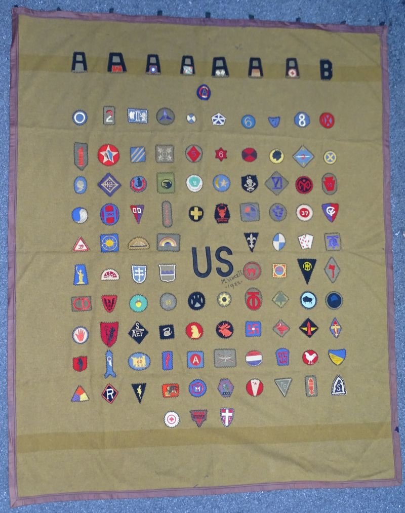 Wool blanket measuring 66-1/2 X 83 inches, with bound edges, 'US' embroidered in the center with embroidered name 'M Vincett 1922'. There are 108 patches attached with decorative stitch work, most of the patches are in excellent condition.