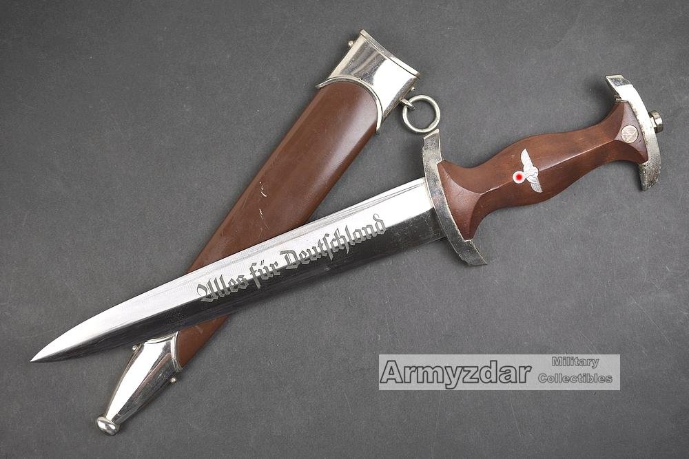 This is a really nice NSA dagger with scabbard. The scabbard has original brown color. On the blade is maker marked RZM M7/12 and of courser Alle für Deutschland. The blade is in a very good condition. The wooden grip is nice with untouched pin and eagle.