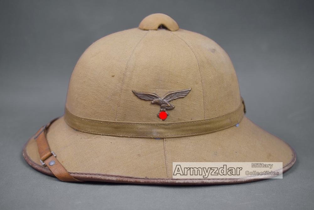 This is a very nice untouched Luftwaffe tan pith helmet in a very good condition. The eagle and the decal are original made from tombak. The helmet has also original chinstrap.