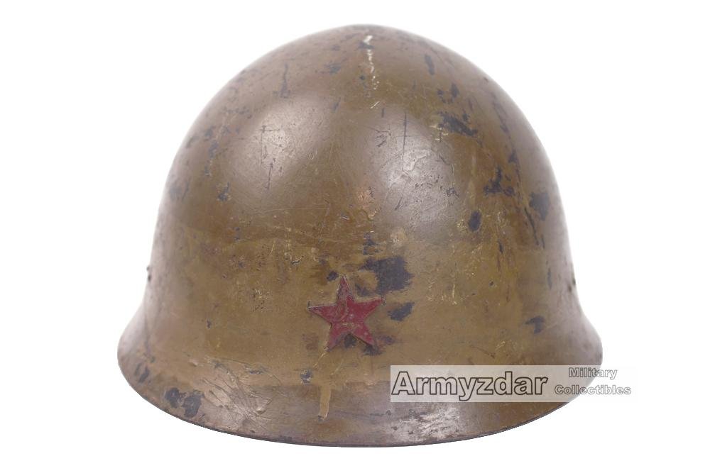 This is a good used original WW2 Japanese Type 90 helmet. The helmet has original paint and front star. The star is red panited. It is still unknown why, but time to time shop up in USA helmet with different color painted star. It is probably color of army branch and it was painted in small unit. Red color is Infantry. The leather liner is in a good condition and just missing chinstrap.