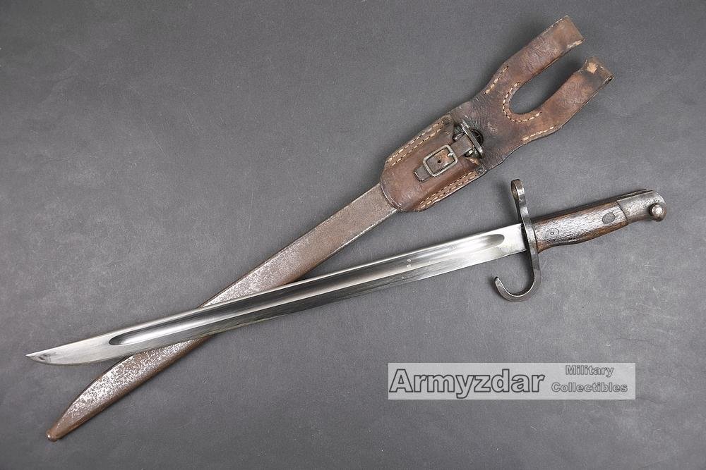 This is a very nice WW2 Japanese bayonet M1930. The bayonet is in a very good condition with leather frog. On the blade is maker marked Hoten Arsenal.