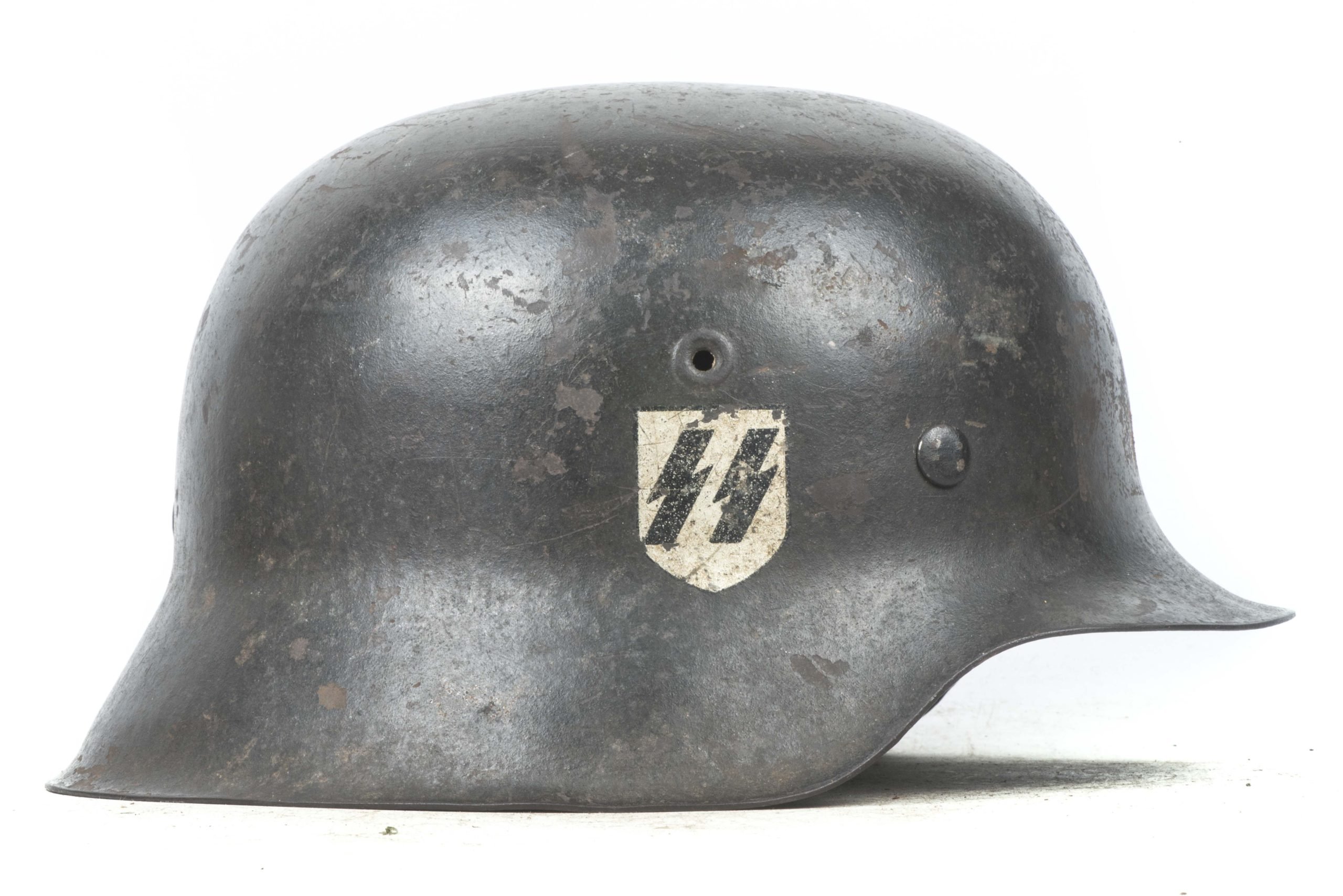 EF62 M42 Waffen-SS single decal helmet named Sawatzki in excellent condition. Typical single decal Waffen-SS helmet with its original factory decal, paint and factory installed liner. This helmet was once a part of the Baugnez44 museum collection which has sadly closed. The helmet was originally found in the Ardennes but I am not sure where its exact finding place was. The helmet is a textbook example in good used condition and would be hard to upgrade!