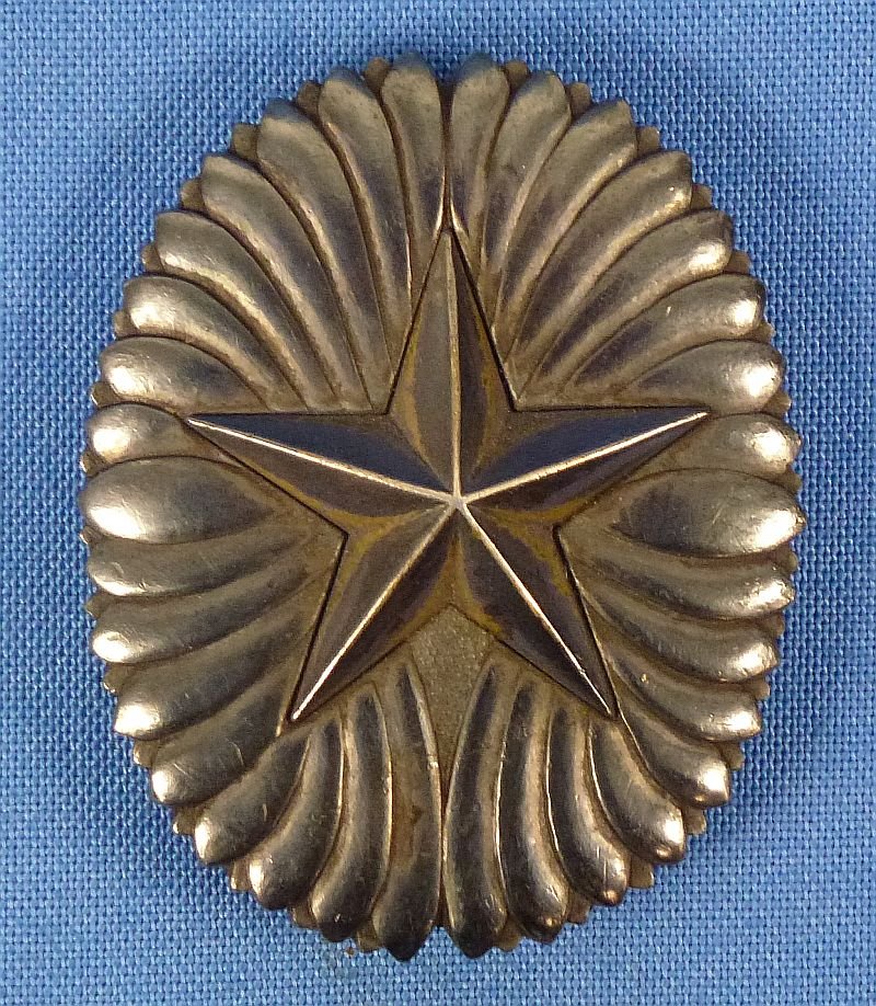 Approximately 1-7/8 inches long. Multi-piece riveted construction. The badge has a fine and uncleaned patina. Excellent condition.