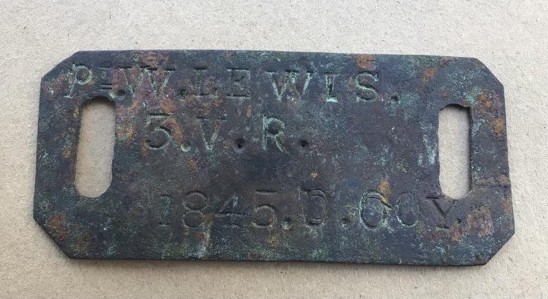 'Pt W Lewis 3.VR 1845 D Coy' Ground dug in the Ballarat area.Approximately 135mm x 60mm. Stable ground dug condition.The 'Old 3rd' Battalion Victorian Rangers were based in Ballarat. A unit with a long Pre-Federation history in Victoria.