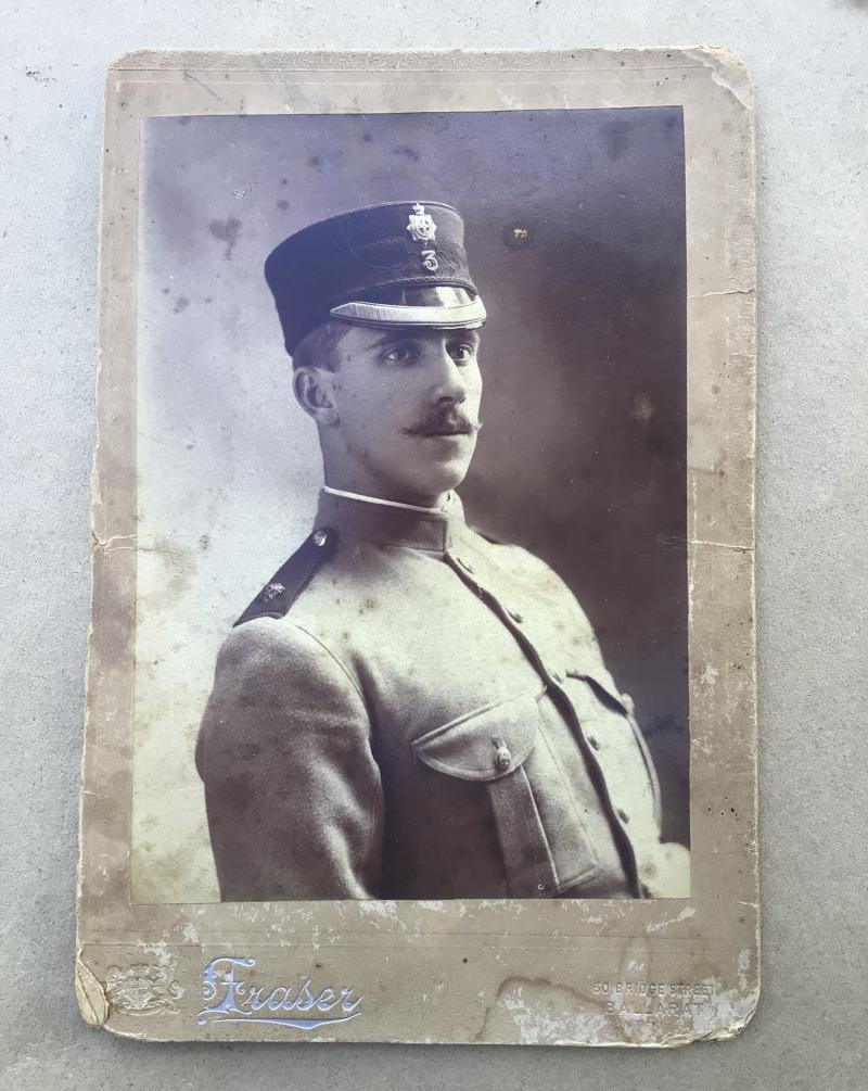 c. 1890's Large card backed original photograph of a junior officer of the 3rd Battalion, Victorian Rangers ( Ballarat Rangers). Lovely studio head and shoulders shot in khaki wool uniform and officers field servcie cap. 'Fraser ' photographer , Bridge St. Ballarat. Approximately 165mmx 250mm. Wear to the card edges approx with age. A name 'Robert Ernest Williams' hand written on the reverse.