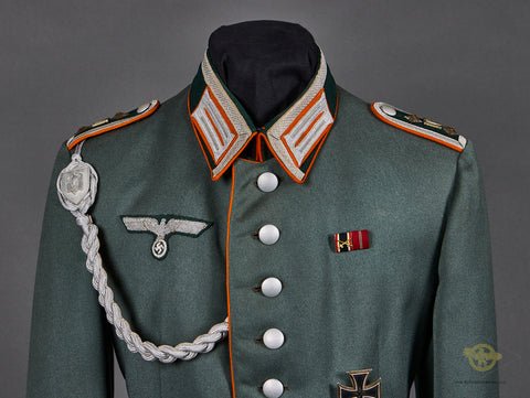 WWII German Army Recruiter NCO Waffenrock and Visor Cap Grouping-This is a special set! Starting with the tunic which is produced in an extremely soft, field gray wool. The jacket is very clean with extremely slight discoloration and wear from use. There is an eight button closure and all buttons are silver finished pebbled metal. The closure seam, cuffs, front and lower edge of the dark green badge cloth collar and tail are piped in orange for recruiter personnel. The collar tabs are orange badge cloth with bright silver NCO tresse columns. The front and lower edge of the collar is also lined in silver and NCO tresse. There are sew in shoulder boards of green badge cloth with silver NCO tresse around the entire perimeter. The underside is green and the piping is orange. There are two pips on each, along with the Roman Numeral IV for Wehrkreis 4. The breast eagle is an officer type in bright silver bullion with silver highlights. This is over dark green wool and it is hand applied. There are loops for two different badges on the left side, plus a small ribbon bar above. There is a marksmanship lanyard properly attached to the button under the shoulder board and to one of the closure buttons. The cuffs are green badge cloth. This bright silver NCO tresse around the edge as well as orange piping. The cuff tabs are identical in construction to the collar tabs. The entire interior is lined in green rayon that is in very good condition., with minor wear and a few small holes. There is a pocket on the left side as well as two vertical pockets in the tail. There is a waist belt with a plated metal buckle. There is also some wear and discoloration up at the area of the neck by the collar. This is definitely from use. The tunic is a size medium. The visor cap is also a gem, being produced in very soft wool that is extremely fine. It has minor wear and discoloration only. There is orange piping around the top panel as well as at the upper and lower edges of the dark green badge cloth center band. The insignia is all silver finished aluminum and in great condition. There is a black patent leather chin strap and a very shiny black vulkanfibre visor with minor crazing. The underside is finished in a cream hue with cross hatching. The interior is fully lined in gold rayon. There is a fully intact rhomboid shaped moisture shield. This is marked with maker nomenclature that reads Mutzen-Ritter, Freiberg I Brsg. There is a tan leather sweatband that is in fine condition with minor wear and discoloration from use. The cap is approximately a size 56. An excellent set overall in a very scarce waffenfarbe.