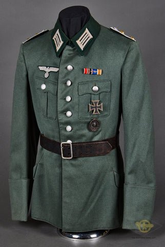 WWII German Army Early Tunic for Engineer Officer-This is for a captain who was an engineer (pionier). It is a very early example in extremely soft, field grey wool that is excellent. It is extremely clean and damage free. There are four pockets with scalloped flaps. The breast pockets are pleated while the hip pockets are internal. There is an eight button closure (top one present but popped off) and all buttons are silver finished pebbled metal. The dark green Badge cloth collar has very minor wear only. The collar tabs are matte gray bullion with black litzen. The shoulder boards are the sew in type with a silver flat wire face over a black badge cloth underlay. Each has a pair of gold finish metal pips indicating the rank of Captain. The breast eagle is bright silver bullion with bright silver highlights over dark green badge cloth. It is neatly hand applied. There are loops for two sets of badges on the left side. One is on the pocket and the other is just below. There is also a set of loops for a medium sized ribbon bar, one of which is included. The interior is partially lined and gray ribbed rayon. There is a white elasticized waist belt with a plated metal buckle. At one time there was a tailor tag in the neck area, but this is gone. The tunic is a size medium. Overall excellent condition!