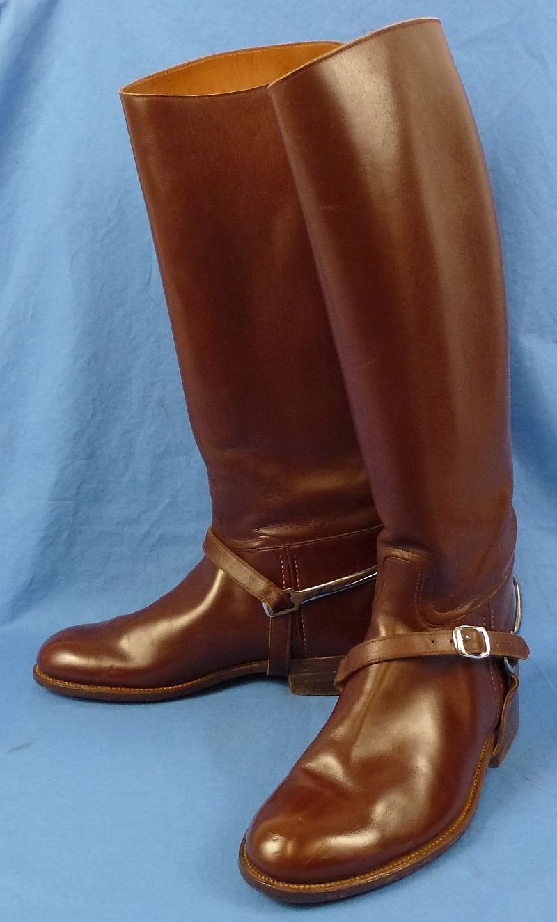 The very clean brown leather boots are approximately 18 inches tall, with a length of approximately 11 long when measured on the exterior sole from toe to heel. The soles and the heels exhibit some wear, but the boots are in very fine polish and are in excellent condition. The boots remain fitted with their spurs.
