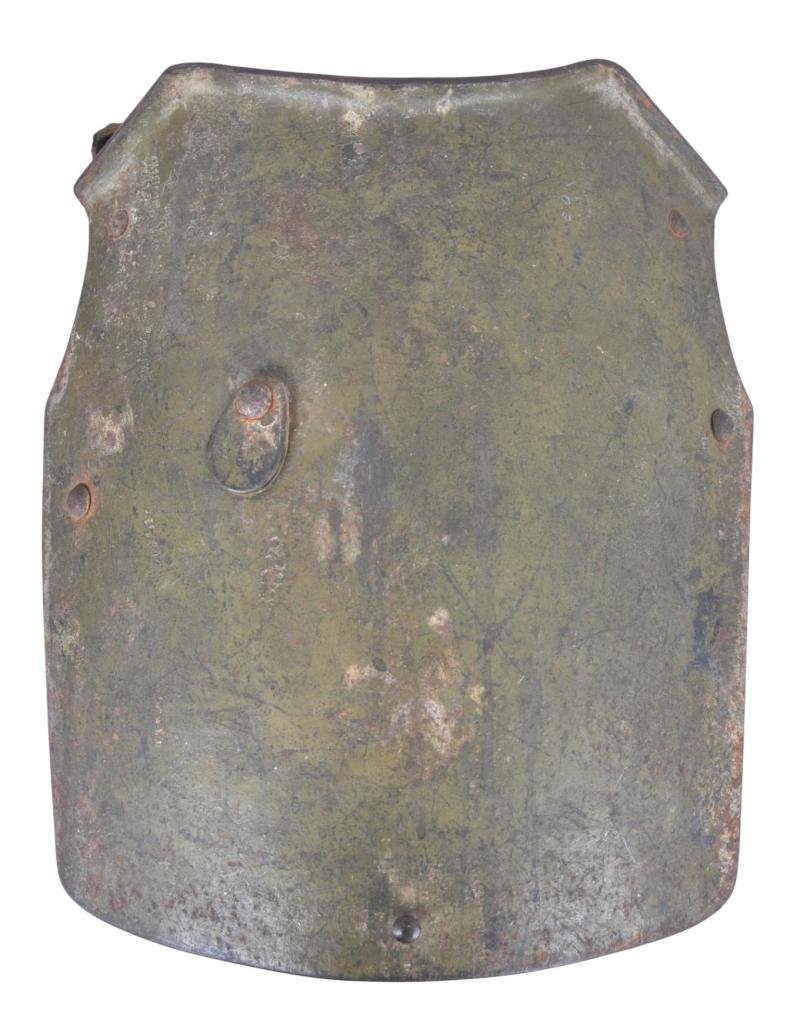A rare piece of WW1 Italian Body Armour complete with swivel covered peep hole , leather securing straps & swivel legs to rear.Italy experimented with a large number of Body Armour variants as the Great War progressed the body shield 'Ansaldo' made by Societa Anonima Italiana & the armoured waistcoat of Fariselli by the Astori Company in Milan being two such examples. This shield follows the familiar patterns of most encountered with integral peephole & swivel legs at the rear which could be folded down in order to use the whole thing as a rifle shield on the ground when in action. The reed green factory paint is 100% original & largely intact . To the reverse are also the remains of a leather securing strap system & also a glued in paper tag which has the remains of some pencil applied writing. A set of serial type numbers are also present to the rear which may be a stores code but could also be an old collector/museum inventory serial number from some time ago as was often seen in many early European collections in the not so distant post war period.Rare piece of WW1 Italian equipment almost unobtainable in todays market.*** International buyers please discuss shipping options before purchasing as heavy item ***