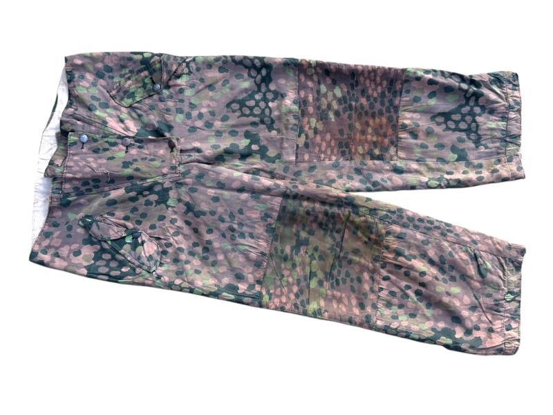 Original Waffen-SS DOT M44 Reversible Trousers in beautifully worn condition.A fine example in a very good size, showing genuine period wear that adds to its authenticity and character. The fabric retains strong color and detail, with honest signs of use consistent with age.There are a few small repairs on the pocket flap, and the inner pocket is missing.Nevertheless a very nice and rare example!