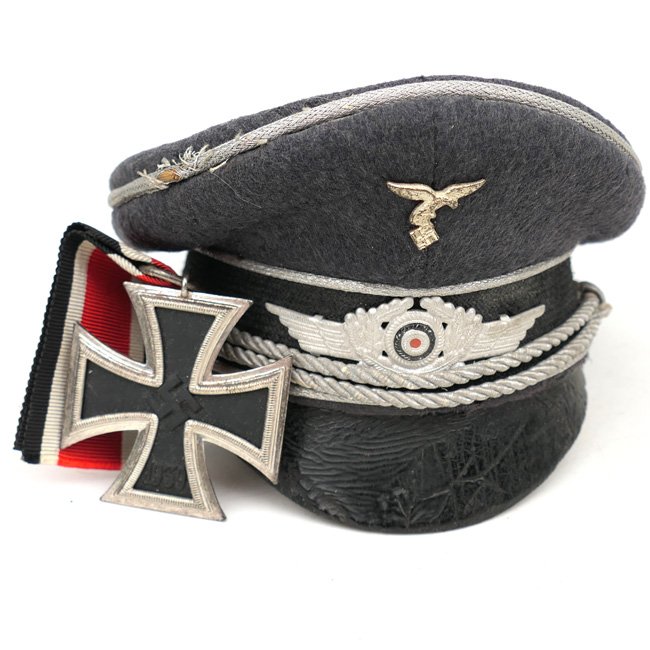 Rare period tailor made miniature Luftwaffe Officer's Visor Cap (Miniatur Schirmmütze für Offiziere). Visor caps were a standard item for all armed forces personnel during the Third Reich period. Although enlisted personnel were issued their caps from government supplies they were also permitted to purchase privately tailored caps. This is a rare tailor made miniature of a Luftwaffe Officer's visor cap, complete with leather visor, sweatband and celluloid diamond. The cap is not visible maker marked or dated. The miniature visor cap is complete with miniature chin strap, cocarde and cap-eagle. Probably made as a gift or intended for an expensive children's doll. There is some minor (moth)damage, mainly on top, see photos. The photo showing the cap next to an Iron Cross 2nd Class is for size comparison. Rare and decorative original period made miniature visor cap!