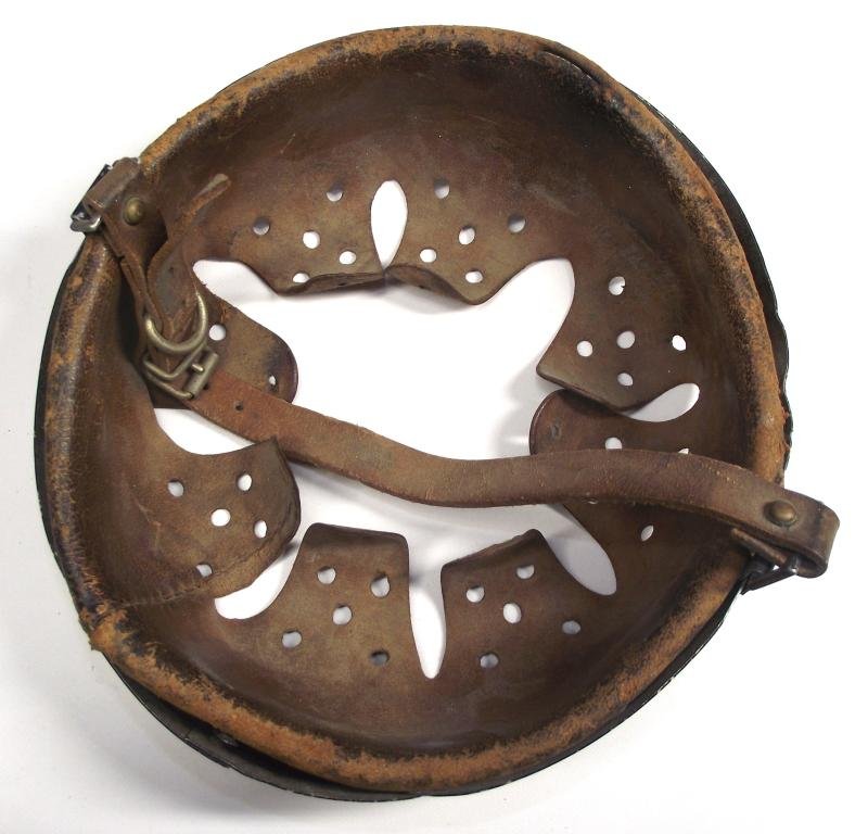 Used example with a nice supple complete liner with its early size stamp to the actual leather, size 56, with the outer band stamped 64 so there's your helmet size folks. Leather has toned from use with one 1inch split to the brow area, inside has a large blue ink stamp ''56N''. The aluminium frame is complete but with a number of kinks as seen in the photos with both Square cornered chinstrap bales present. With one side stamped 64 the other side has stamped details to the firm Schuberth- Werk and a 1935 date.The chinstrap was found with the liner and im selling as is as it was on the helmet before having the inside skirt of its period helmet painted black as seen by some diffused paint areas on the frame and some minor color seen on the chinstrap. This black paint will be easy to remove with acetone.