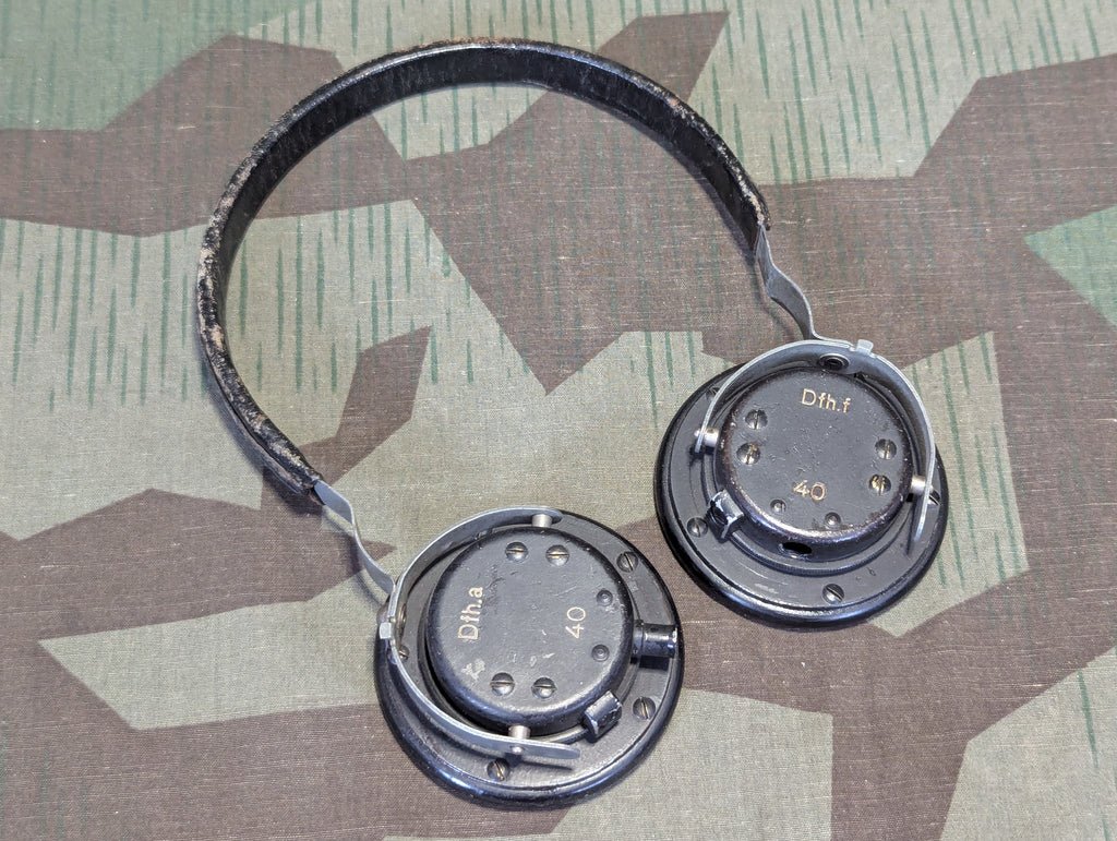 Original 1940 made Dfh.a. field radio headset. Good set to rebuild. The cords are completely missing, but what remains is in fairly good condition. The little spring cord protectors are also missing from each ear piece and one is even missing the stub for the spring. I do not know if these are working, but its safe to assume not. This is just a great basis from which to rebuild a functional set.