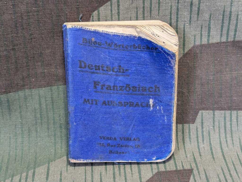 Small German - French dictionary. Printed in Belgium. Its worn with some dog eared pages and the blue cover is separating from its paper backing slightly. I could not find a date. It seems pre war. possibly WWI era.