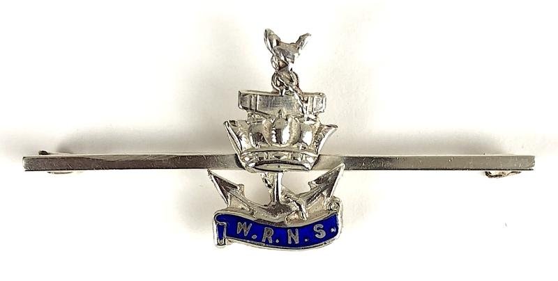 A good original wartime period 'Women's Royal Naval Service pin brooch'; Jenny Wren' mounted on anchor with 'Naval Crown' and 'W.R.N.S.' title scroll below inlaid with blue enamelling, the reverse impressed 'SILVER'. Very good condition, complete with original pin fittings, no defects to the enamel.Size approx 51 x 22mm.