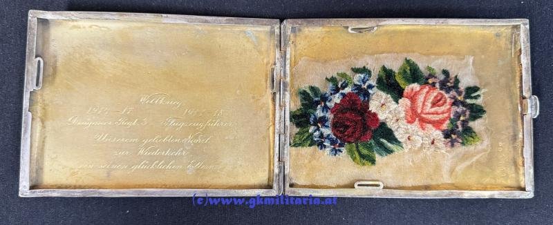 k.u.k. Zigarettentabatiere k.u.k. Luftfahrtruppe - Flugzeugführer Kpl. Karl Guttmann FLIK 24+39!! - Silber Dianakopfpunze und Seriennummer und teilweise emailliert (kl. Dellen und Chips im Email) - 150,5 Gramm Silber - Es fehlen auch die Gummibänder - mit Widmung: ' Weltkrieg 1914-1917 Dragonerregiment 3 - 1917-1918 Flugzeugführer - Unserem geliebten Nanzl zur Wiederkehr von seinen glücklichen Eltern! ' - Korporal Guttmann war der einzige Flugzeugführer der vorher beim Dragonerregiment 3 diente - Er war bei der Fliegerkompanie 24 und 39 stationiert - guter gebrauchter Zustand! - selten!