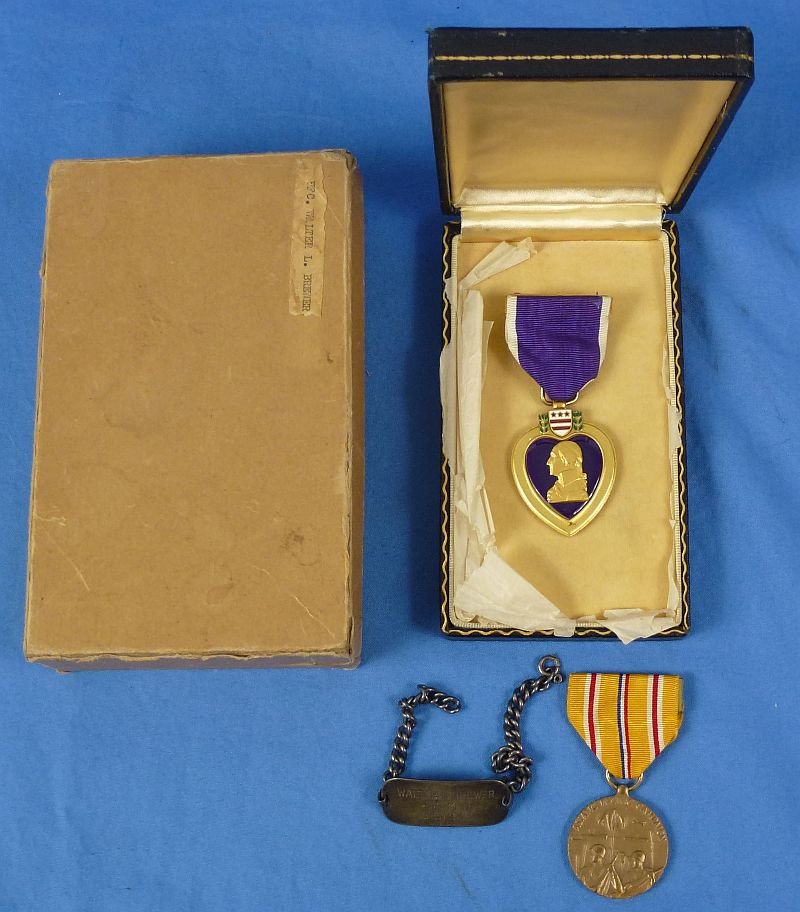 The Purple Heart has a full wrap brooch suspension, and it is hand engraved on four lines to 'PFC. Walter L. Brewer. USMCR.'. The medal is contained within its titled black leather Navy style 'coffin' case, together with a crimp brooch Pacific Campaign Medal and Private Brewer's identification bracelet. The case exterior shows surface spots, and the lid is just a bit elevated by virtue of having been kept for decades with the Pacific medal and the identification bracelet inside of the case. The case is contained within its protective cardboard box, which bears a typed label on the lid which bears Private Brewer's name. Private First Class Walter Lake Brewer had serial number 550564, and he served in the Pacific Theater as a member of Company H of the 3rd Battalion in the 6th Marine Division. He was killed in action on May 18, 1945, during combat on Okinawa. The Purple Heart has a few small spots and patina, but overall the group is in excellent condition.