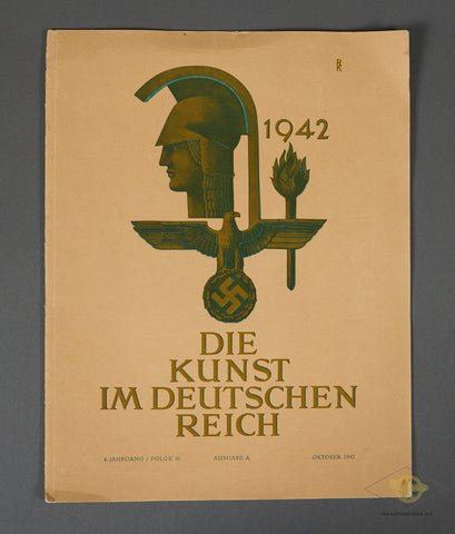 Die Kunst Im Deutschen Reich Oktober 1942-This is a soft cover, large format booklet that features art from the Third Reich. There are period advertisements in this volume. The photos are mostly large format and black and white. This booklet measures 14 inches (35.56cm) long by 11 inches (27.94cm) wide. There is some wear but overall, this is in very good condition. Very Interesting stuff!
