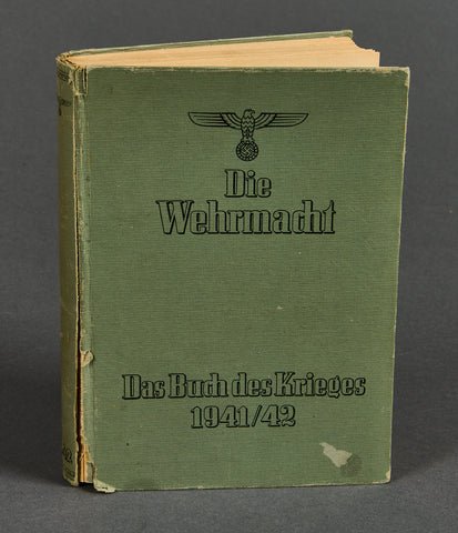 Die Wehrmacht, Das Buch des Kriegs 1941/42- The full title of this book is Die Wehrmacht, Das Buch des Kriegs 1939/40, Herausgegeben vom Oberkommando der Wehrmacht. The dust cover is missing on this copy. The book is dated 1942. There is some wear, discoloration, and binding separation, but all pages are intact. Very good condition overall. The German's loved their yearbooks, and this book was used as a propaganda tool to build support for Operation Barbarosa, or the invasion of Russia in 1941. This book is filled with some great captioned black and white photos illustrating the battles on the Eastern Front. It is in very good condition.