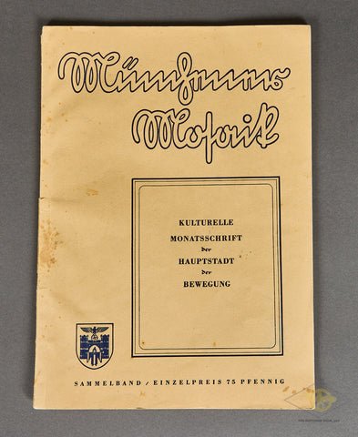 Münchener Mosaik::Kulturelle Monatsschrift der Hauptstadt der Bewegung 1941-This magazine was a monthly cultural magazine promoting art deemed acceptable by the party. This soft cover magazine contains approx. 57 pages with color plates showing painting, sculpture etc. It is in very good condition, though there is some age spotting to the front and back cover. This has a tight binding and is very clean and readable. An interesting original third Reich publication.