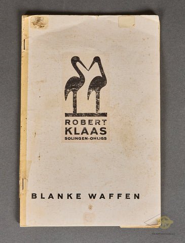 Robert Klaas, Solingen-ohligs, Blanke Waffen Catalog-The famous blade maker is advertising swords, daggers and knives many of which are decorated with the Nazi swastika. Includes a product line introduction and price list. This is an original German 1938 printing of the Robert Klaas Waffen Fabrique Catalog. This small softback catalog looks almost brand new, this is not the 1977 reprint of the catalog, this is an original 1938 copy. The illustrations are beautiful. It contains 17 pages of swords and daggers. If you look at page 14, you can see the engravings offered. Great addition to any collection, and very hard to find the original and not the reprint. Please be aware that the front cover shows some fading and what appears to be an old sticker in the upper left corner. The back page does have a significant tear in the lower edge, please see photos.
