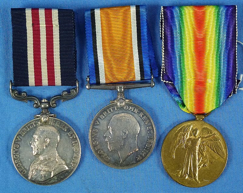 The trio of medals is comprised of the Military Medal for Bravery in the Field, named to C-5655, Pte. R. Allan, 18 / High L.I.; The World War I Victory Medal, which is named to 5655, Pte. R. Allen, High L.I.; and the 1914-1918 War Medal, named to 5655, Pte. R. Allen, High L.I. The medals show uncleaned patina, with very good detail. The medals are in excellent condition. Please note that there is not a typographical error in this description; the last name of the recipient was spelled differently on the Military Medal ('Allan') than it was on the other two medals ('Allen'), although the service number is the same on all three medals.
