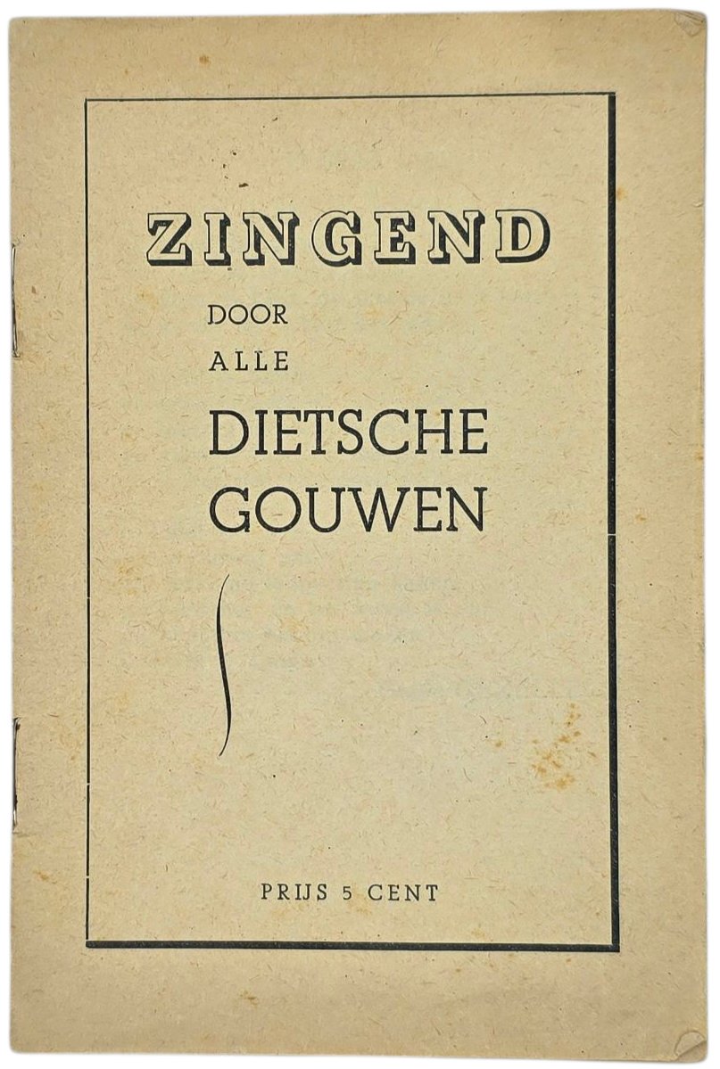 Original WW2 Dutch Collaboration NSB Brochure - Zingend door alle Dietsche gouwen, Melchert Schuurman (1943)Small damage on the backside.Originele Wo2 Collaboratie NSB Brochure -Zingend door alle Dietsche gouwen, Melchert Schuurman (1943)Kleine beschadiging aan de achterkant.