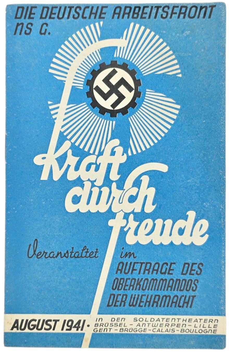 Original WW2 German KDF Brochure - Soldatentheatern Brüssel, Antwerpen, Lille, Gent, Brügge, Calais, Boulogne, August (1941)Kraft Durch Freude. Program brochure, some damage on the backside.Originele Wo2 Duitse KDF Brochure - Soldatentheatern Brüssel, Antwerpen, Lille, Gent, Brügge, Calais, Boulogne, August (1941)Kraft Durch Freude. Programma brochure, wat schade achter.