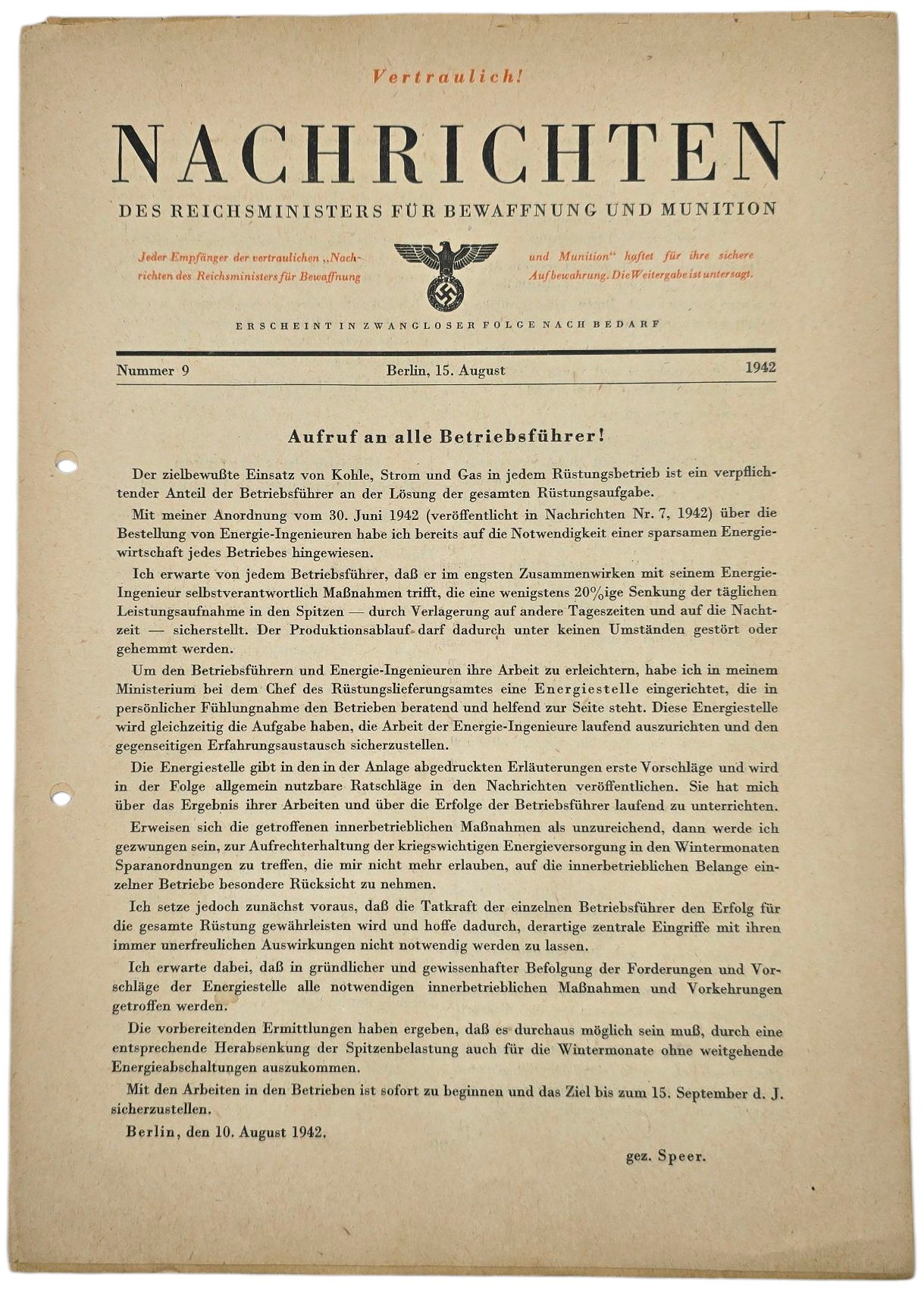 Original WW2 German Document - Nachrichten des Reichsministers Für Rüstungs und Kriegsproduktion, Nummer 9 (1942)Information from the Department of War Production, by Albert Speer.Perforated.Origineel Wo2 Duits Document - Nachrichten des Reichsministers Für Rüstungs und Kriegsproduktion, Nummer 9 (1942)Informatie van de departement van oorlogsindustrie, door Albert Speer.Geperforeerd.