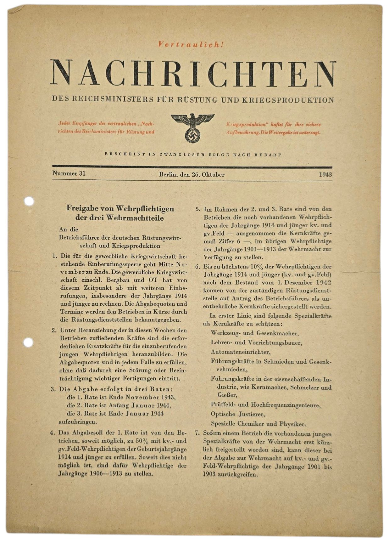 Original WW2 German Document - Nachrichten des Reichsministers Für Rüstungs und Kriegsproduktion, Nummer 31 (1943)Information from the Department of War Production, by Albert Speer.Perforated.Origineel Wo2 Duits Document - Nachrichten des Reichsministers Für Rüstungs und Kriegsproduktion, Nummer 31 (1943)Informatie van de departement van oorlogsindustrie, door Albert Speer.Geperforeerd.