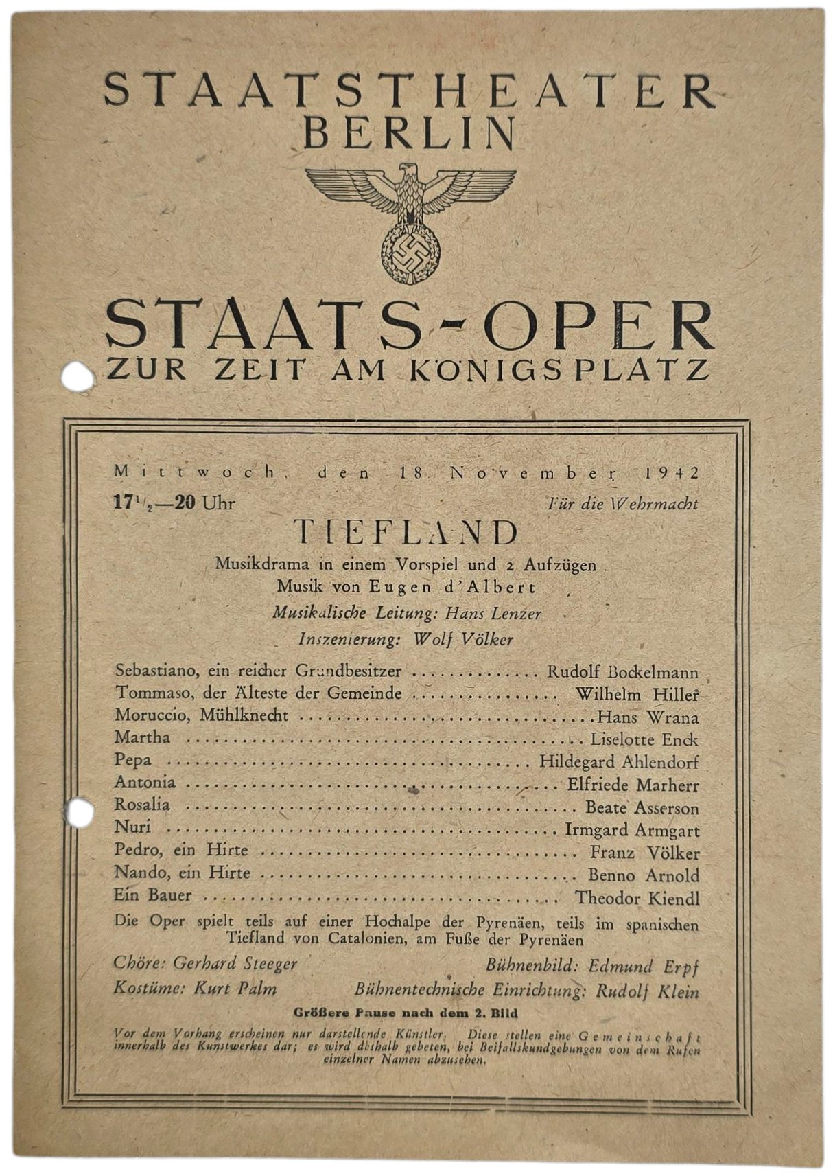 Original WW2 German Document - Staatstheater Berlin Staats Oper Für die Wehrmacht, Tiefland (1942)