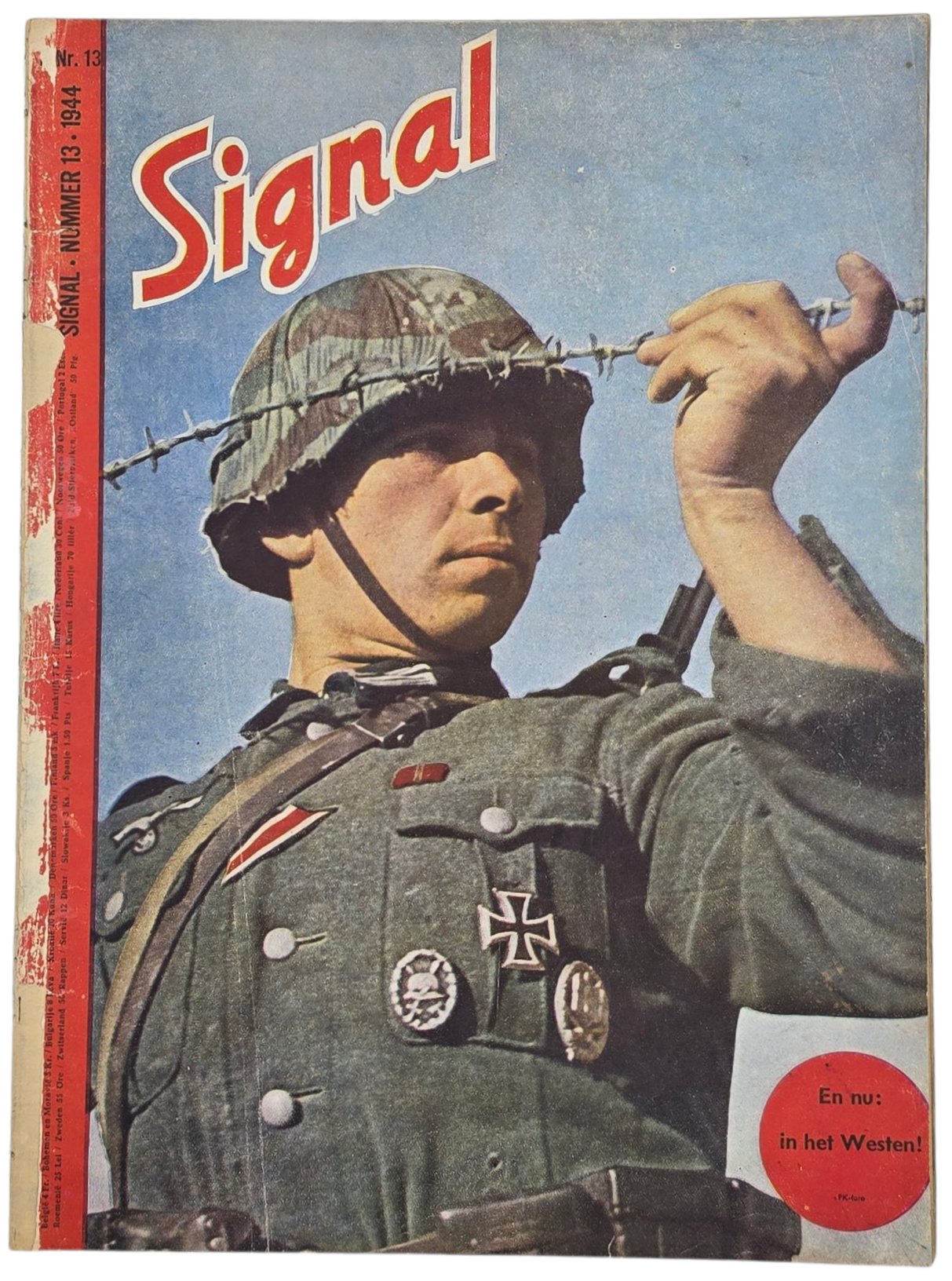 Original WW2 German Magazine -Signal No. 13. Dutch language (1944)The spine is damaged and the sides have been cropped.The German magazine ''Signal'' is probably the most iconic WWII magazine published during the war. The magazine has been published in many European languages from 1940 to the end of the nazi rule of Germany in 1945. While the wartime editions are not hard to find, the first 4 of 1940 and every edition above No. 14 from 1944 are difficult to come across.Origineel Wo2 Duits Tijdschrift -Signal No. 13. Nederlandstalig (1944)De rug heeft schade, en het nummer is bijgesneden.Het Duitse tijdschrift ''Signaal'' is hoogstwaarschijnlijk het meest iconische Wo2 tijdschrift uitgegeven tijdens de Tweede Wereldoorlog. Dit tijdschrift is in vele talen uitgegeven vanaf 1940 tot het einde van de nazi heerschappij van Duitsland in 1945. Terwijl de oorlogse edities van Signal niet moeilijk te vinden zijn, zijn de eerste vier edities van 1940 en elke editie na nummer 14 van 1944 lastig te vinden.
