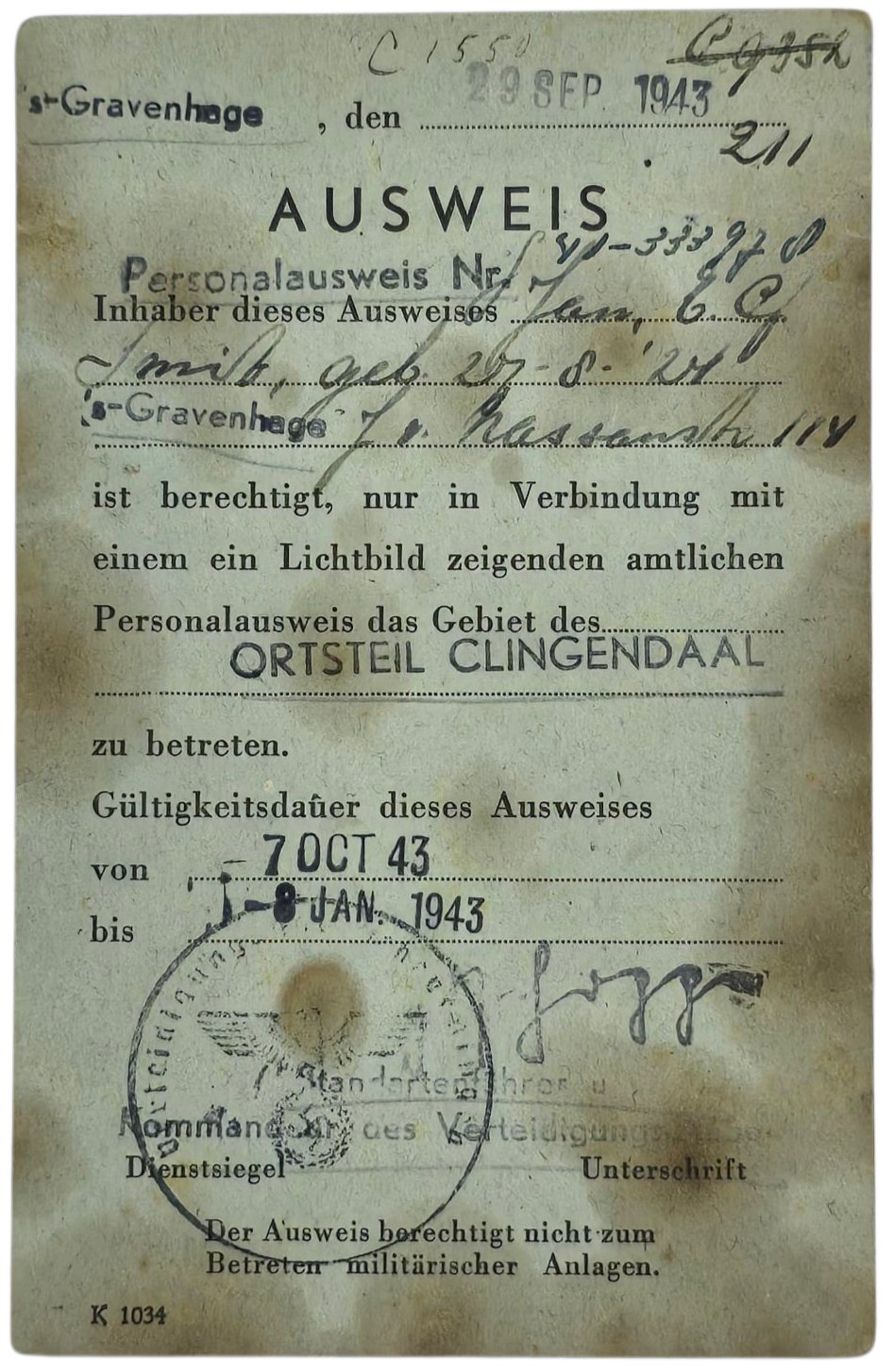 Original WW2 Dutch German Document - Ausweis Ortsteil Clingendaal, The Hague (1943)Interesting Ausweis for entering the area of Clingendaal. This was the location of the bunker of Arthur Seyss-Inquart.The backside has paper remains.Origineel Wo2 Nederlands Duits Document - Ausweis Ortsteil Clingendaal, Den Haag (1943)Papierresten achterop.Interessante ausweis voor toegang op het gebied Clingendaal, hier stond onder andere de bunker van Arthur Seyss-Inquart.